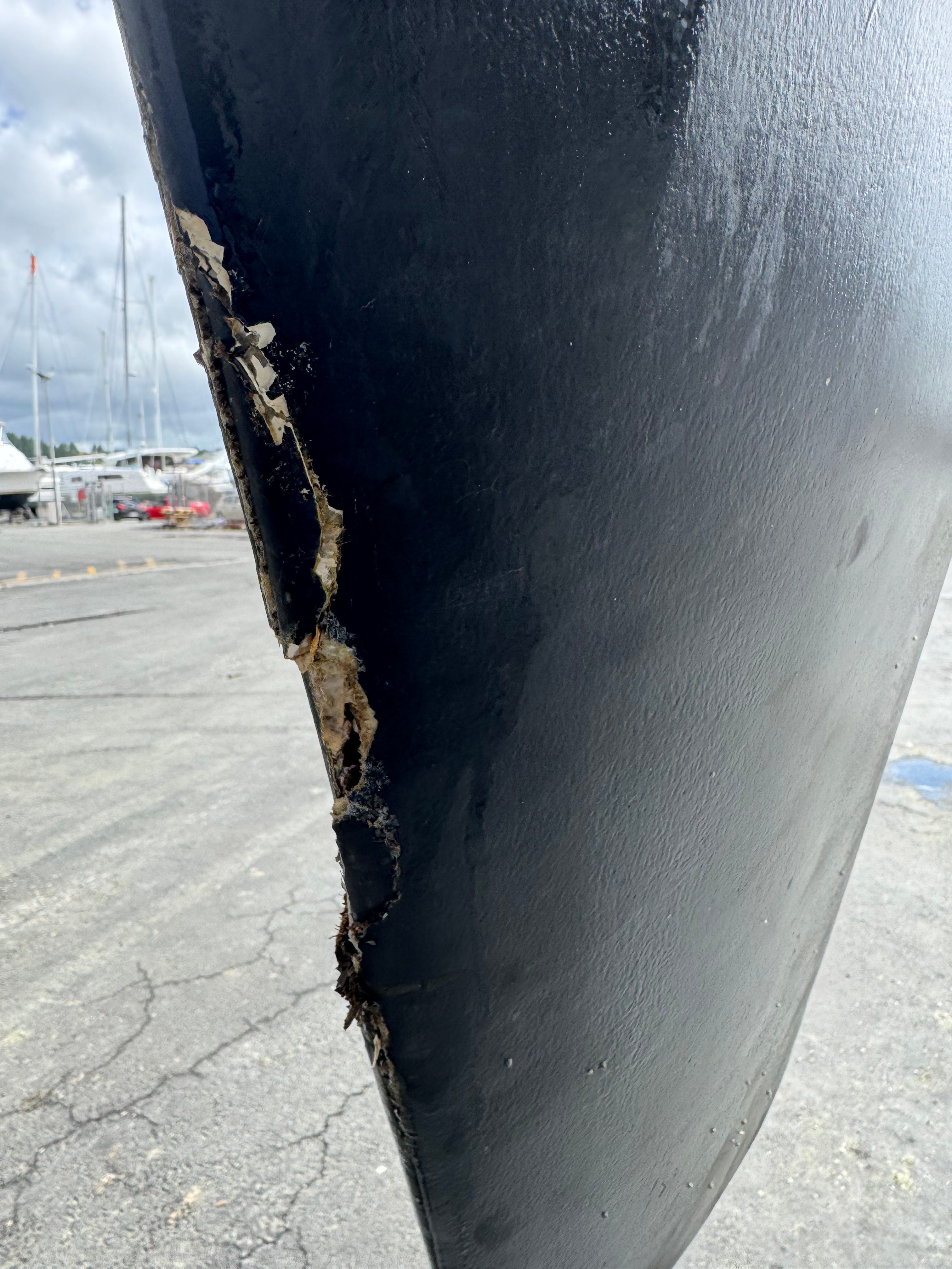 While Illimité is out of the water I am having a ding in my rudder repaired. We hit some small logs at night during our South Island attempt in February and one of them I think did this